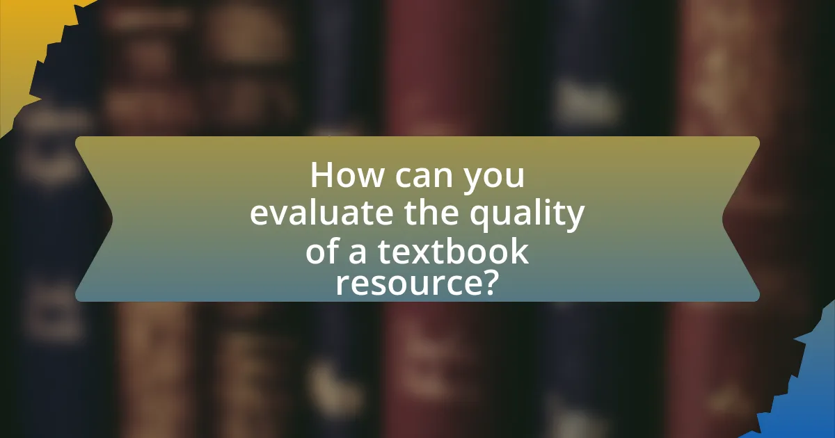 To evaluate the quality of a textbook resource, assess its content accuracy, relevance, and pedagogical effectiveness. High-quality textbooks are factually correct, up-to-date, and aligned with current educational standards. For instance, textbooks that undergo peer review and are authored by experts in the field typically demonstrate higher reliability. Additionally, consider the organization of the material, clarity of explanations, and inclusion of supplementary resources, such as exercises and assessments, which enhance learning outcomes. Research indicates that textbooks with clear learning objectives and structured content significantly improve student comprehension and retention, as shown in studies by the National Center for Education Statistics.